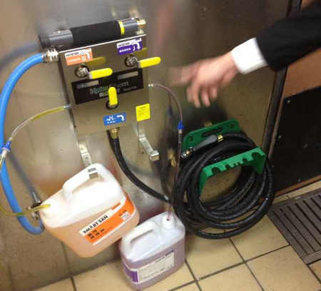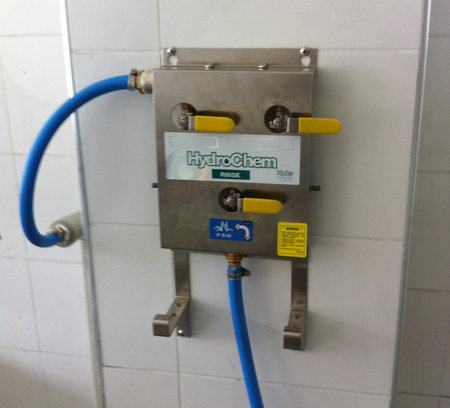 可懸掛二種清洗消毒液體,按比例自動混合,另外一個(gè)路接口為自來水,直接可以沖洗。 自動混合液體方便使用。